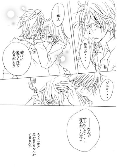 注:不良達は、隼人がすでにボコボコにして追い払いました。 後編終了ですvお疲れさまでした!! お礼なんて言われる立場じゃないのに・・・・。恵ちゃんにとっては、襲われたことの怖さよりも隼人が自分のために駆けつけてくれたことが何より嬉しかったんだと思います。 back